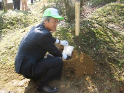 式典に先立ち各来賓は自分の名前が立てられたウンゼンヒノキの前で施肥を行い、私もその作業を行いました。