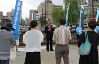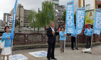 8月30日、時折り局地的に激しい雨がたたきつける日でしたが、雨の合間をぬって長崎市の鉄橋(中央橋)で街頭演説を行いました。