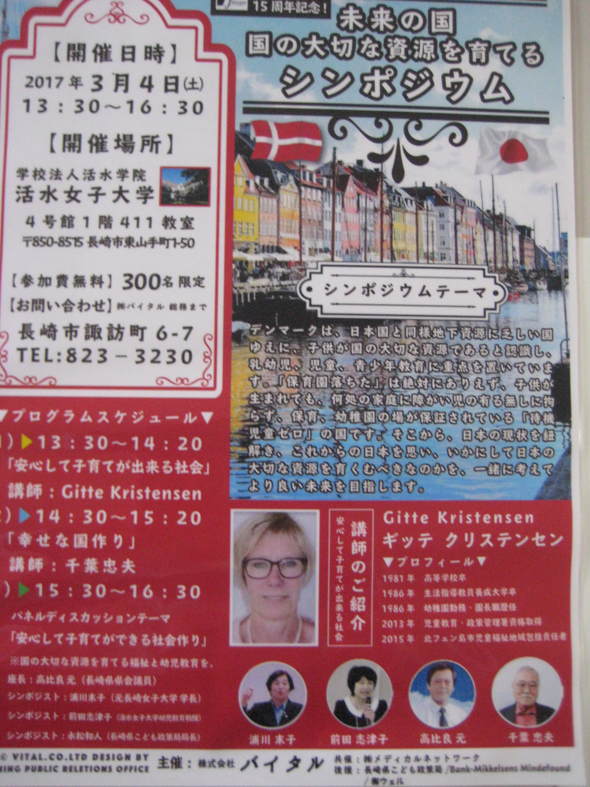 デンマークから子育て政策を担当している専門家やノーマリゼーション(障害者に,すべての人がもつ通常の生活を送る 権利を可能な限り保障することを目標に社会福祉をすすめること。デンマークの取り組み から生まれた理念)を提唱し、普及に努めたデンマークのバンミケルセンの財団の理事長を招へいし、講演をいただくとともに、私が進行役を務め、前長崎女子短期大学長の浦川氏や活水女子大准教授の前田氏、長崎県こども政策局長の永松氏等による「安心して子育てができる社会づくり」について、パネルディスカッションを行いました。